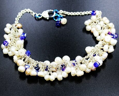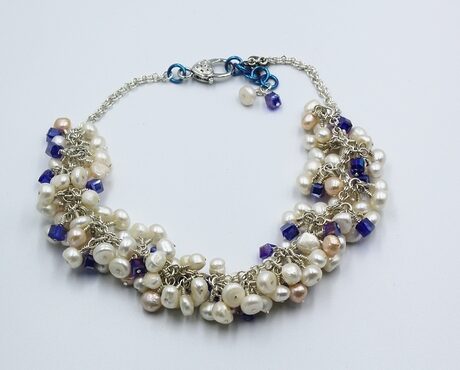 Freshwater Pearls, Dark Blue Crystals on a Silver-Plated Chainmaille