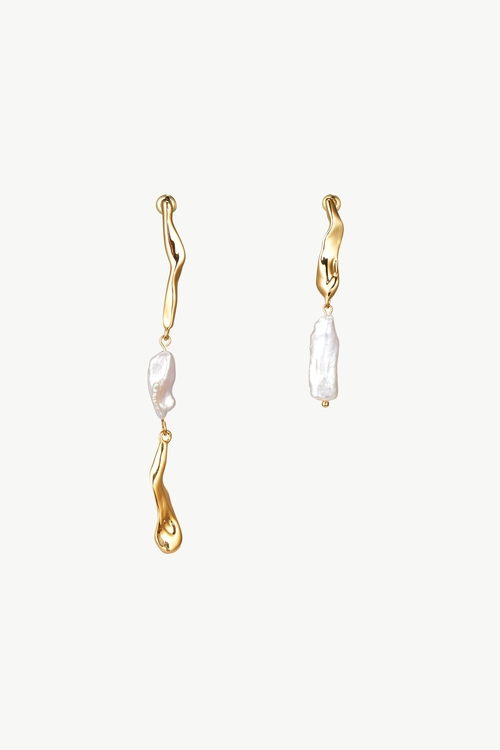 Unique molten style earrings with asymmetrical design, adorned with luminous nature baroque pearls. It’s a perfect balance of minimal and statement-making, also great for wear on its own or pair with the matching necklace.