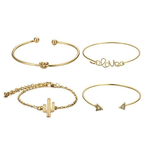 4 Individual bracelets that can be worn in any order. One with the word “love”, and others featuring a knot, a cactus, and two arrows.